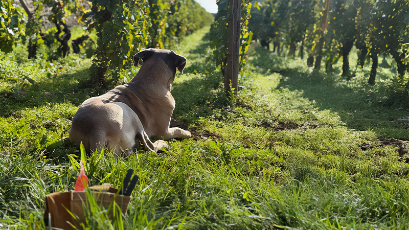 This old Cromin vineyard is the only parcel adjoining the domaine — it connects directly to our buildings. It is as much a place of life as of work, and every family member feels deeply attached to it. Even Rudy, the family dog, visits it daily for a stroll and often keeps the vineyard workers company.